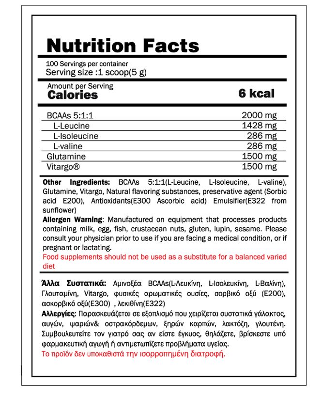 Δοσολογία: Για καλύτερα αποτελέσματα, καταναλώστε 1 δόση 5γρ.(1 scoop ) 20 λεπτά πριν την προπόνηση και 1 δόση μετά την προπόνηση.