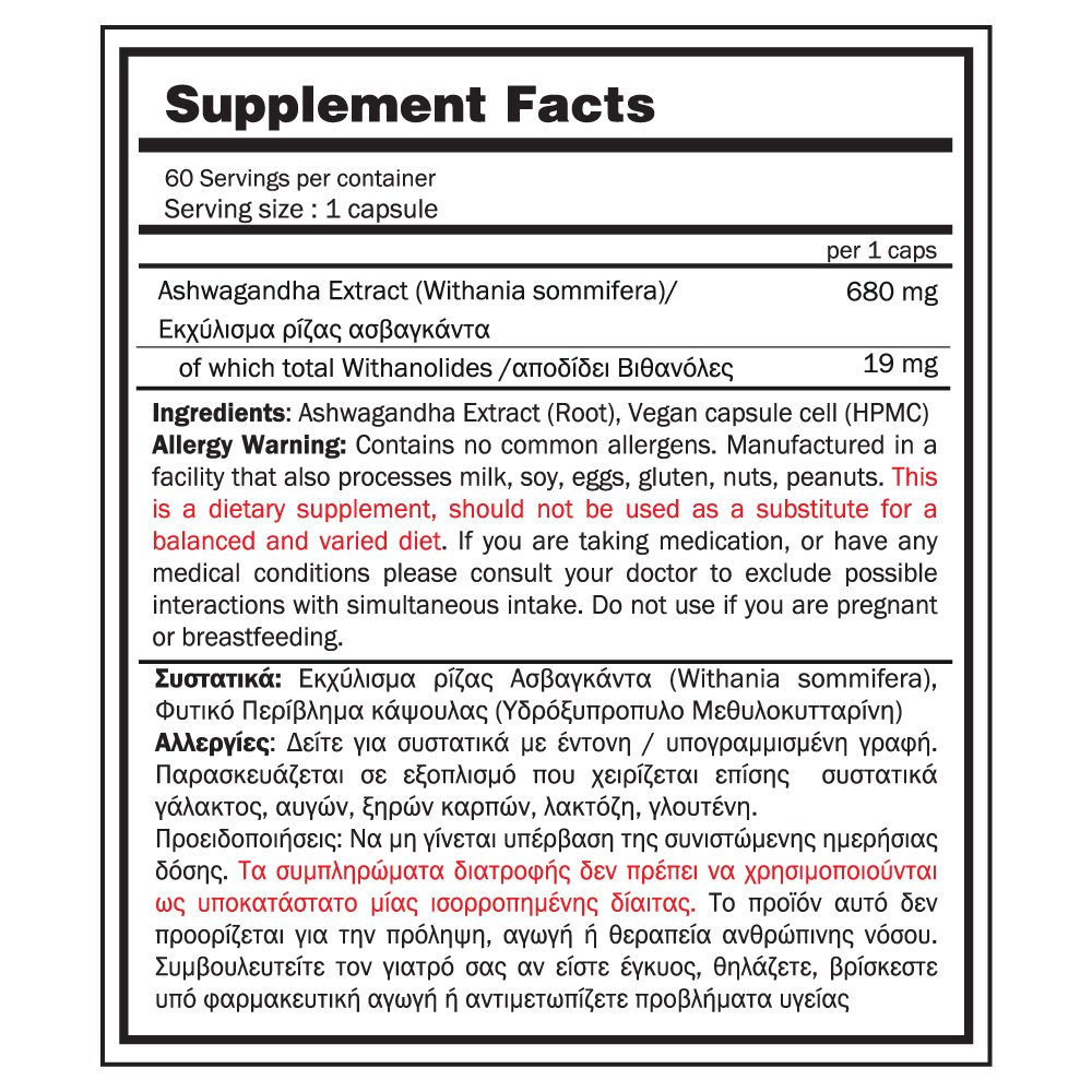 H Ashwagandha (Withania somnifera) είναι ένα φυσικό  βότανο με ισχυρή αντιοξειδωτική και προσαρμοσιογόνο δράση, το οποίο χρησιμοποιείται εδώ και αιώνες στην Αγιουρβεδική ιατρική. Η φόρμουλά μας παρέχει 680 mg εκχυλίσματος ρίζας Ashwagandha ανά κάψουλα, τυποποιημένη ώστε να περιέχει 19 mg withanolides, τις κύριες δραστικές ενώσεις του φυτού, για στοχευμένη δράση, στην υποστήριξη της σωματικής και ψυχικής αντοχής.