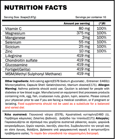 Περιέχει όλους τους γνωστούς συμμάχους των που βελτιώνουν την υγεία των αρθρώσεων MSM, glucosamine, chondroitin καθώς και FORTIGEL®.   Είναι ιδανικό για τις αρθρώσεις των αθλητών που επιβαρύνονται καθημερινά από την προπόνηση, τις χρόνιες φλεγμονώδεις καταστάσεις ή ακόμα και από την λανθασμένη στάση σώματος στη δουλειά ή τον ύπνο.  Επίσης, είναι ιδανικό για τις μεγαλύτερες ηλικίες που αντιμετωπίζουν προβλήματα φθοράς και αλλοίωσης των αρθρώσεων και των χόνδρων.