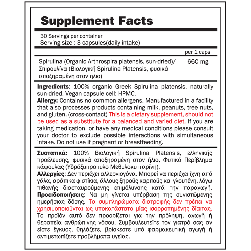 • Υποστήριξη ανοσοποιητικού συστήματος: Χάρη στο β-καροτένιο, τη φυκοκυανίνη και τα φυσικά αντιοξειδωτικά που περιέχει, συμβάλλει στην προστασία των κυττάρων και ενισχύει το ανοσοποιητικό σύστημα, καθιστώντας το πιο ανθεκτικό στις λοιμώξεις.