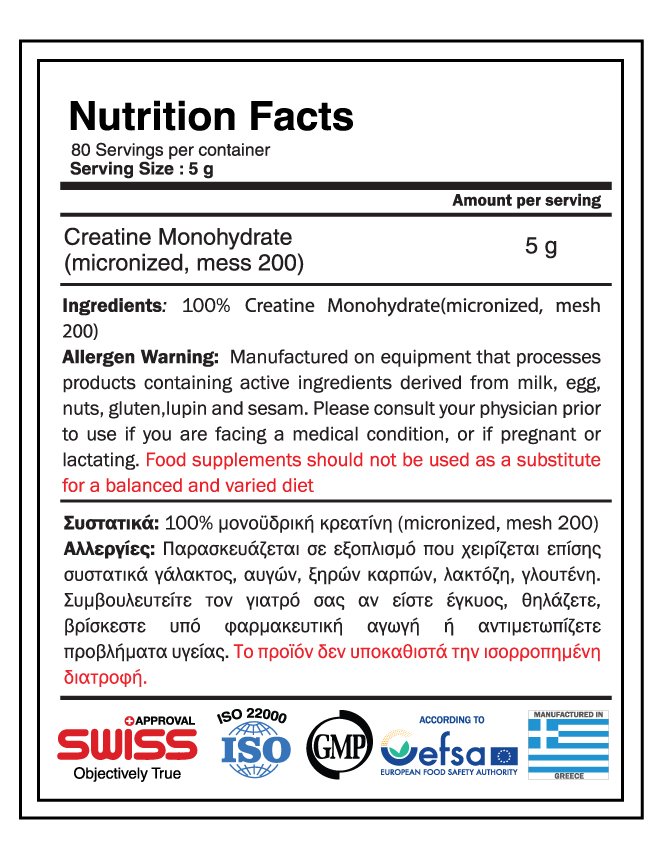 Δοσολογία: Καταναλώστε 5 γρ.(=10ml στο scoop) καθημερινά. Κατά προτίμηση καταναλώστε πριν ή/και μετά την προπόνηση, μαζί  με χυμό ή άλλο υδατάνθρακα, καθώς τα σάκχαρα των υδατανθράκων αυξάνουν την απορρόφηση της κρεατίνης.